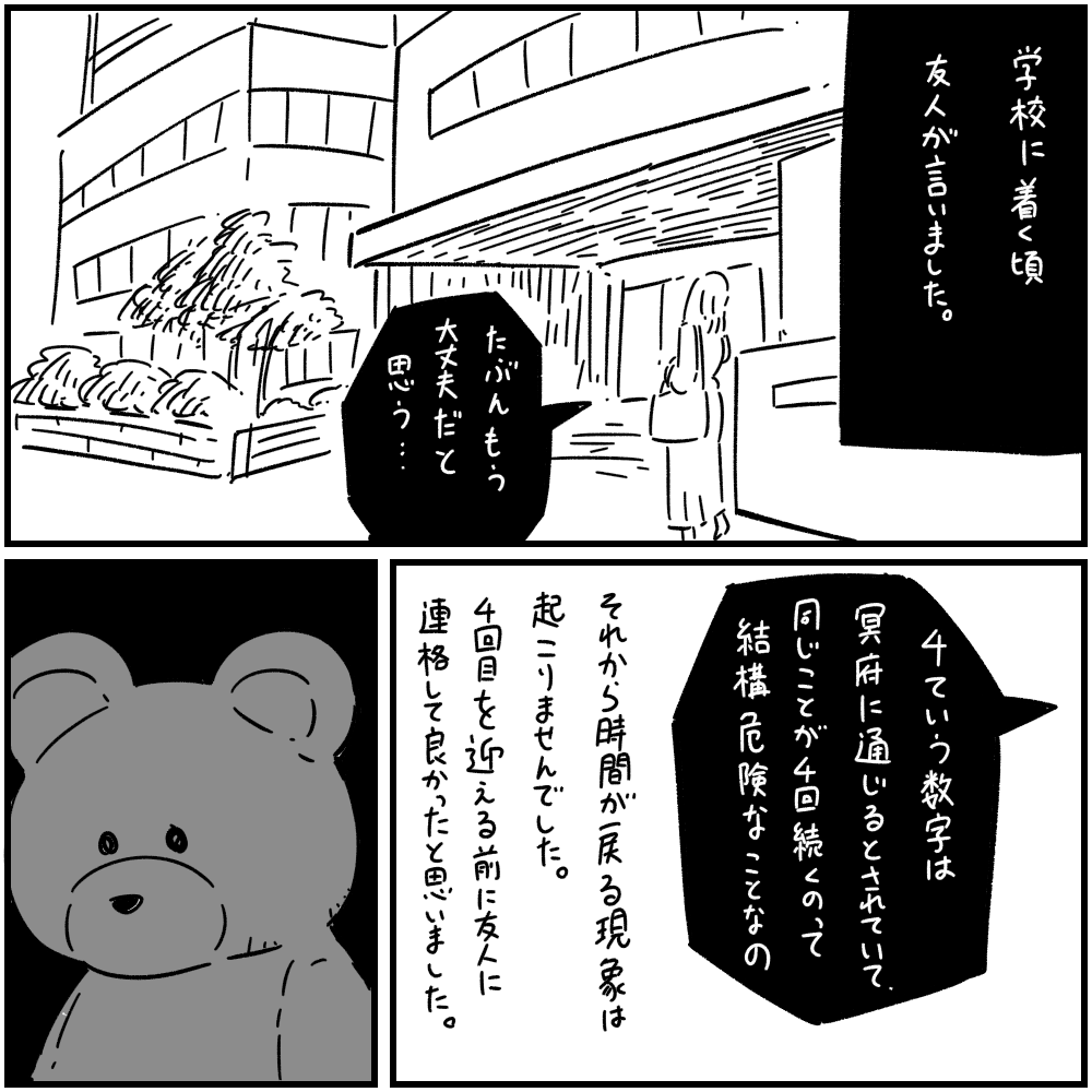 フォロワーさんの「本当にあった怖い話」その18 2020年08月24日 フォロワーさんの「本当にあった怖い話」その18 「フォロワーさんの体験談」カテゴリの最新記事 タグ :#本当にあった怖い話#ホラー#漫画 < 前の記事次の記事 > コメント コメント一覧 (8) 1. ヨガっ子 2020年08月28日 10:24 クマの人形にひぃ… 0 siroyagisanti がしました 2. ぽ 2020年09月10日 19:47 カケホーダイじゃなかったら電話代が怖いことに… 0 siroyagisanti がしました 3. まる 2020年09月15日 11:24 クマ…動いてる… 0 siroyagisanti がしました 4. ななっしー 2021年06月09日 21:22 よく見たらクマのぬいぐるみの姿勢が変わってる… 0 siroyagisanti がしました 5. name 2022年05月04日 13:11 ホントだ、1回目、2回目、3回目とクマがだんだんこっち向いてる。 0 siroyagisanti がしました 6. 名無し 2022年08月11日 03:21 こんなことありえんのかな、幽霊見たとかならわかるけど。 0 siroyagisanti がしました 7. コンニチハ 2023年06月27日 16:06 くまがだんだんこっち向いてきてる、、、こっわ、電話してたから、ベッドに戻らなかったのかな? とにかく、よかったね、☺️ 0 siroyagisanti がしました 8. 名無し 2023年08月03日 20:31 似た事あったな 0 siroyagisanti がしました コメントフォーム 名前 コメント 記事の評価 リセット リセット 顔 星 情報を記憶 コメントを投稿する