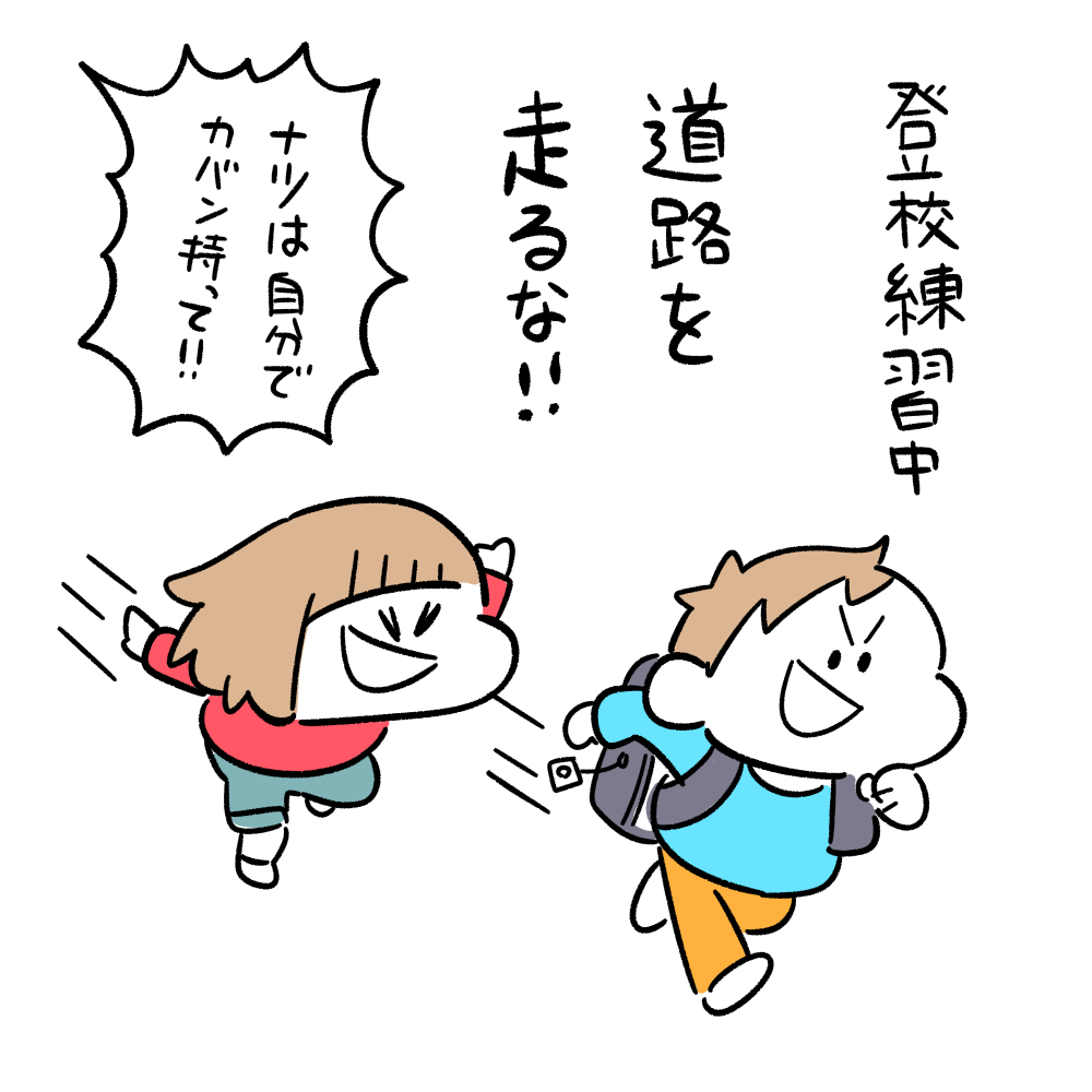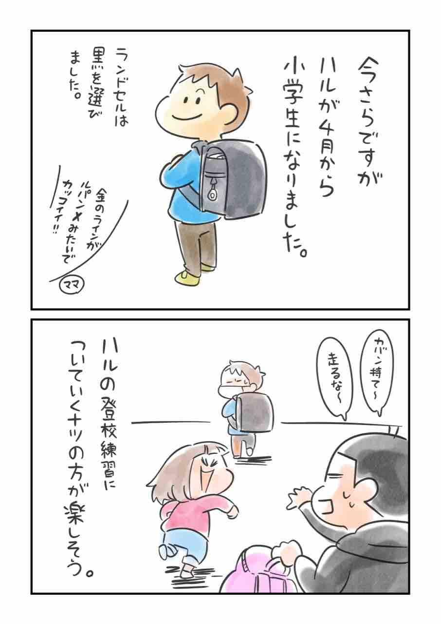 4月初め、小学校へ一人でで歩いて登校できるように一緒に歩いて練習していたのですが、朝からお散歩できることが嬉しすぎるナツに追いかけられて逃げるハルに怒る父の図です。