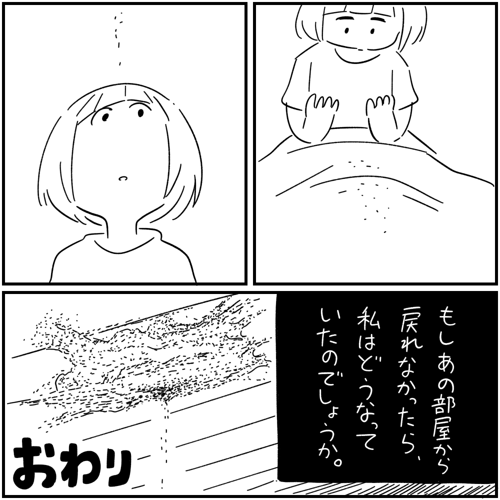 怖い話その50「幽体離脱をやめたら」最終話 2021年07月04日 フォロワーさんの本当にあった怖い話その50「幽体離脱をやめたら」⑤この話は、怖い話その10「幽体離脱」のその後に起こった出来事です。 最初から読みたい方はこちらへ 怖い話その10「幽体離脱」はこちらです 皆さんの怖い話募集中です!インスタかツイッターのDMで教えてください!10代の話の書籍発売中です!10代の時のつらい経験、私たちはこう乗り越えました (メディアファクトリーのコミックエッセイ)しろやぎ 秋吾KADOKAWA2021-06-24 「フォロワーさんの体験談」カテゴリの最新記事 タグ :#本当にあった怖い話 < 前の記事次の記事 > コメント コメント一覧 (23) 1. ***** 2021年07月04日 18:24 海外のホラー映画でインシディアスってのをツタヤで借りた気がする。 最近、Netflixでも見かけて2回目見た。 幽体離脱が癖になって向こう側の悪い奴につかまって、父親が体から離れて迎えに行くんやけど、父親だけ戻ってこれなくて父親の体に違う奴が入るって話。 その映画見てから、意識不明なった人も含めて戻ってきたの本人なんかな?って怖くなる。 0 siroyagisanti がしました 2. . 2021年07月04日 18:40 今回もワクワクしながら読ませていただきました!! 要望なのですが、前回のお話へのリンクと次のお話へのリンクが欲しいです…! いつもツイッターから拝見していますが、プロフィールに飛んでからブログに飛んでいるので、 ツイート内リンクなどで先読み誘導もしてもらえると助かります。 0 siroyagisanti がしました 3. ... 2021年07月04日 19:10 その後はもう呼ばれずに済んだんだろうか? コメント2の方も仰ってますがツイートから直接ブログの記事にリンク貼ってもらえると助かります。 ツイート→プロフィール→ブログ→目当ての最新話へとアクセスするまでの手順が多いほど見る人も少なくなるので…まぁブログ記事のURL貼るのも手間だとは思いますが… 0 siroyagisanti がしました 4. ななし 2021年07月04日 20:35 この話すごい面白かった こうなると最後の部屋に実際にいたカップルが気がかり こんなやばい奴がいる部屋にいて無事なのか…? 0 siroyagisanti がしました 5. なまなまさん 2021年07月05日 10:52 全然怖くないし、なんでコレなの?画力もないのにつまんない 0 siroyagisanti がしました 9. クソワロタ 2021年07月06日 22:15 >>5 なぜ見に来たのかwwwwww 0 siroyagisanti がしました 18. 草ァ! 2022年06月28日 15:39 >>5 とにかく阿保みたいに情報量多い絵のことを「上手い絵」って思ってそうw 0 siroyagisanti がしました 19. 通りすがり 2022年07月04日 17:13 >>5 いやじゃあ見るなよ そんなに人を責めて楽しい? 0 siroyagisanti がしました 6. もるるる 2021年07月05日 11:22 こ、こわぃぃぃ つまんないなら読まなくていいのに!って思う! 毎日更新が楽しみです(*」´□`)」 0 siroyagisanti がしました 7. たけひろ 2021年07月05日 12:29 いつも楽しみに拝見してます! 今回もこわかったです。 扉を開ける毎に部屋が腐っていき、最後は砂になったのは何かしらの暗示ですかね… 0 siroyagisanti がしました 8. こわすぎ! 2021年07月05日 15:39 ドキドキしながらつづき待ってました! 今回もおもしろかったです! 次も待ってます!しろやぎさんの表現、好き! 0 siroyagisanti がしました 10. マイ 2022年01月06日 16:12 最後のセリフがわからない あの部屋から呼ばれた? 途中まで良かった映画になればいいのに 0 siroyagisanti がしました 11. Oh 2022年01月08日 10:46 幽体離脱の大家ロバートモンロー氏によると1度幽体離脱を経験したら後戻りはできないやめることはできない、らしいです 0 siroyagisanti がしました 12. Oh 2022年01月08日 10:47 幽体離脱の大家ロバートモンロー氏によると1度幽体離脱を経験したら後戻りはできないやめることはできないらしいです 0 siroyagisanti がしました 13. くーん 2022年02月19日 14:00 糖質一歩手前だったね 危なかった 0 siroyagisanti がしました 14. 死生 2022年02月26日 10:41 むかし横浜の蒔田で、理由は分からないのですが、床も壁も天井も総てが砂だらけの部屋に住んでいました。家賃は6千円でした。床には絨毯やゴザが5枚も重ねてあり、気になって剥がしてみたら 0 siroyagisanti がしました 15. 名無し 2022年03月16日 10:20 >>14 私まだ待ってます、話の続き 0 siroyagisanti がしました 16. 名前 2022年05月04日 14:32 え?最後、天井腐ってきてる?家がシロアリで崩壊寸前の暗示とかかな。 0 siroyagisanti がしました 17. ご 2022年05月23日 01:47 初めて来ました 動くの!反則!夜中に見るんじゃ無かったー! 0 siroyagisanti がしました 20. アシュギーネ 2023年01月06日 14:16 アニメ入ってる力作や よほどこのシーン印象強かったんやなぁ 0 siroyagisanti がしました 21. nanana 2023年06月10日 10:07 こ、こわ…… 最初の幽体離脱の話のときのあの部屋… そんなにやばいやつに 会ってしまってたんですね。 TVに映ってるの、自分が妹と寝てる部屋ですもんね… こわい、これ妹が呼んでくれてなかったら…… 0 siroyagisanti がしました 22. 詐欺では? 2024年01月20日 19:23 夢を幽体離脱ってタイトルにしていいの? 0 siroyagisa