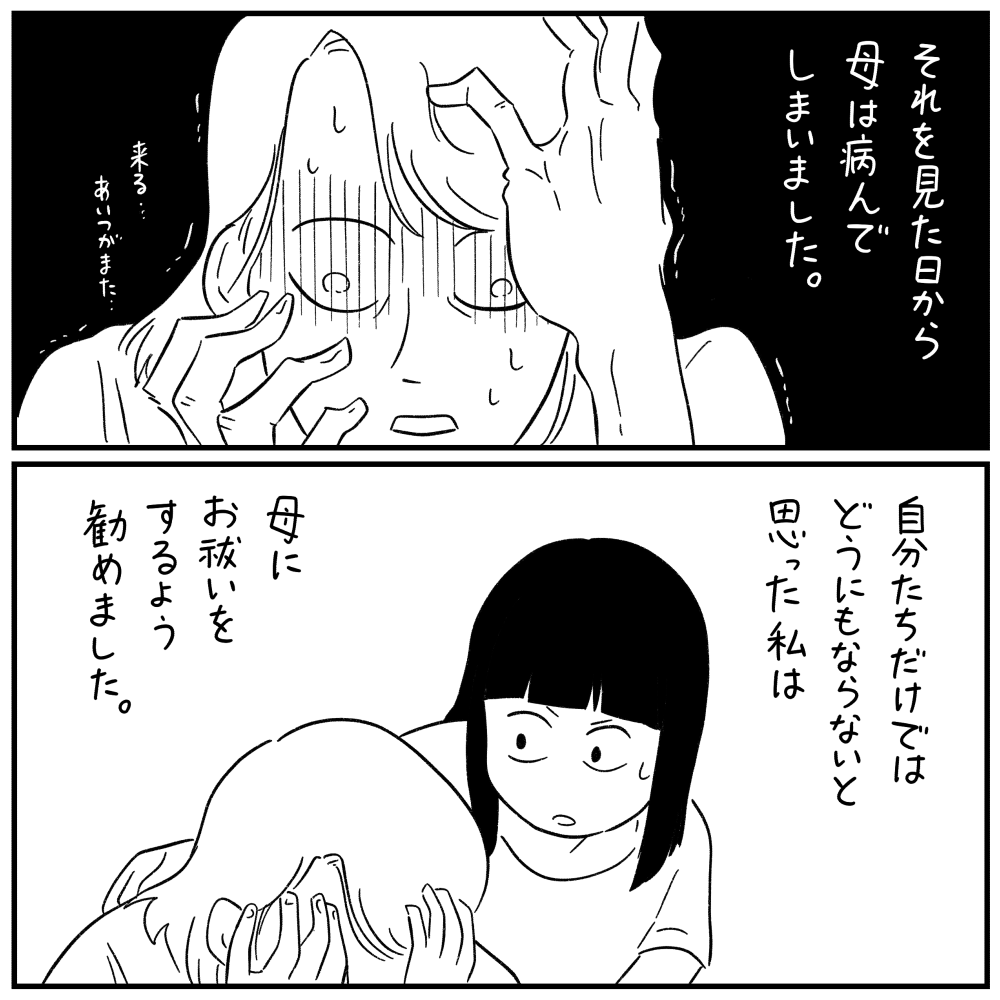 夫からしたら妻が幻覚見ておかしくなって、子供達も集団ヒステリーで騒ぎ出して、インチキ霊媒師の口車に乗せられて私物捨てられた(もしや売られたのでは?)