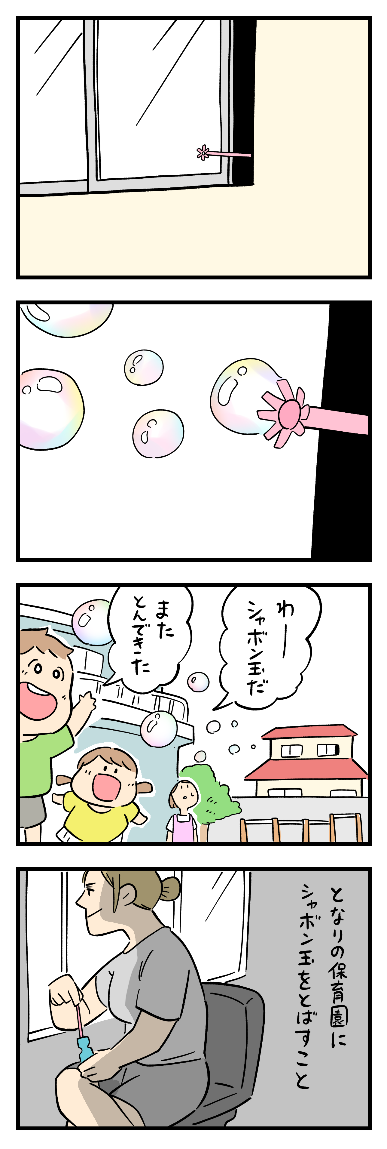 シャボン玉やるときは保育園で色々考えてやると思うんで、子供が騒ぐ声に苦情入れたりしないだけで十分ありがたいと思いますよ😅