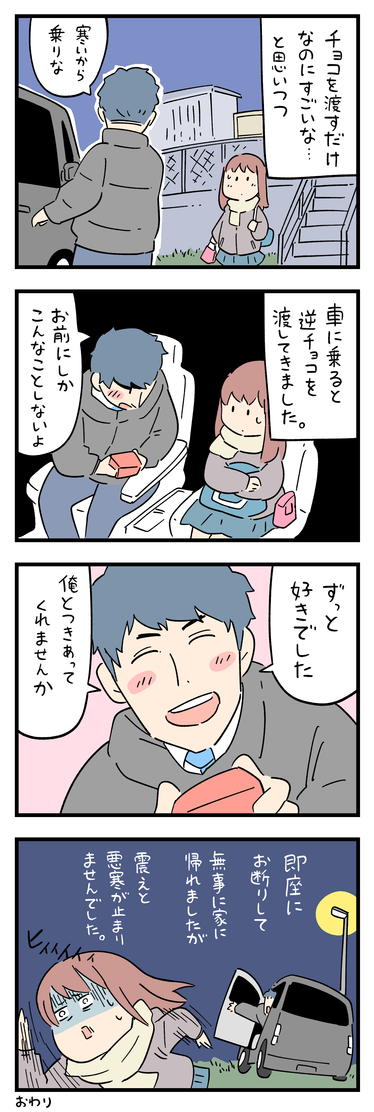 「バレンタインの忘れられない出来事」16-② 2023年02月07日 ひとこと体験談「バレンタインの忘れられない出来事」その16-②ひとこと体験談の電子書籍です全巻無料で読めます! 体験談募集中ですツイッターかインスタのDMで教えて下さい! 「フォロワーさんの体験談」カテゴリの最新記事 タグ :#バレンタインの忘れられない出来事 < 前の記事次の記事 > コメント コメント一覧 (38) 1. 蒐(あかね) 2023年02月07日 18:03 あれ!?思ってた終わり方と違う!!! 0 siroyagisanti がしました 2. あはは 2023年02月07日 18:03 ヤバいヤツやった……😨😨😨 0 siroyagisanti がしました 3. さ 2023年02月07日 18:04 絵だと先生爽やかイケメンだけど実物となると怖いよね(笑) 教師としてもどうかと思うわ! 0 siroyagisanti がしました 4. ヨシノ 2023年02月07日 18:06 「ちょっと怖い話」にエントリーしてほしいくらいぞっとしました。 ご無事で何よりです。 0 siroyagisanti がしました 5. う~ん 2023年02月07日 18:11 先生にしてみりゃ「俺にチョコ用意してるんだし、これはイケる!楽勝☆」って気持ちだったんだろうな~女子はアイドルと付き合いたい訳ではないからな笑 0 siroyagisanti がしました 6. 2023年02月07日 18:16 まじで最近男性教師と女子高校生の恋愛漫画とか多すぎでこれもそういうパターンのやつだと思ってたから断ってくれてよかった 教師との恋愛の何がいいのか分からんよ… 0 siroyagisanti がしました 7. 筋肉妖精ギブス 2023年02月07日 18:26 軽いノリで歳上男性の気持ちを弄ぶからこうなる。 0 siroyagisanti がしました 13. 2023年02月07日 18:42 >>7 生徒から義理チョコ渡されて「弄ばれた!」って思うなら感覚ヤバいよ 普通に考えて「気に入ってる先生」レベルだろ 付き合う選択肢がそもそも無い 0 siroyagisanti がしました 14. な 2023年02月07日 18:43 >>7 こうやって逆恨み犯罪者が生まれるのであった 0 siroyagisanti がしました 22. キッモ 2023年02月07日 19:31 >>7 教師には不適正 0 siroyagisanti がしました 31. ? 2023年02月07日 22:00 >>7 義理チョコって知ってる? 0 siroyagisanti がしました 36. コレあかん 2023年02月08日 11:57 >>7 まさか社交辞令も通じない? 0 siroyagisanti がしました 8. 2023年02月07日 18:26 わざわざ車ってのがね… 0 siroyagisanti がしました 9. ももこ 2023年02月07日 18:27 この先生だれにでも言ってそうだねー 0 siroyagisanti がしました 10. おばば 2023年02月07日 18:37 あの、、、老婆心ですが、女性の皆さん、その気がない人の車には絶対絶対乗っちゃダメです〜❗️ それから、、、これが本当にキムタクか福山雅治さんみたいに 素敵なら、人柄が素晴らしい人なら、怖い話じゃなくて、将来を約束する可能性もありましたよね? 相手によってはストーカー扱いされたり、イケメン扱いするのって、ちょっと悲しさ感じます。 私だけでしょうか? 0 siroyagisanti がしました 15. 2023年02月07日 18:50 >>10 もうキムタクも福山も50過ぎのおじいちゃんやで… あとどっちであろうが生徒に手を出す教師ってだけで気持ち悪い 0 siroyagisanti がしました 17. 2023年02月07日 18:58 >>10 「私だけでしょうか?」 はい、あなただけです。 0 siroyagisanti がしました 32. 2023年02月07日 22:04 >>10 その気がない男の車に乗ってはいけないはその通り たまたま告白だけが目当ての教師だから良かったものの、一歩間違えればそのまま乱暴されていたかもしれないし、最悪生きて帰れなかったかもしれない 若い子は純粋だから疑わずに乗っちゃうのかもしれんけど、本当に気をつけてほしい でも、例えイケメンだったとしても教師からの逆告白は普通に怖い 0 siroyagisanti がしました 11. どん兵衛 2023年02月07日 18:38 教え子と教師で結婚した人を知ってるからか… 思ってた結末と違った😂 0 siroyagisanti がしました 16. 2023年02月07日 18:52 >>11 生徒に手を出す教師は高確率で複数人に手を出してるんだよね 0 siroyagisanti がしました 23. それよ 2023年02月07日 19:33 >>16 だって 入れ食いだと思ってるよ 0 siroyagisanti がしました 12. えー 2023年02月07日 18:41 生徒から告って付き合うのはなくはない。昔もあったよ。でも、教師から先に「ずっと好きでした」はOUT‼️ありえへん 0 siroyagisanti がしました 18. ぬ 2023年02月07日 18:59 これ懲戒免職案件やろ 0 siroyagisanti がしました 19. おぉぅ…。 2023年02月07日 19:14 差し出した逆チョコも、他の女子生徒から学校で渡された物かも知れんしなー 0 siroyagisanti がしました 21. 👏🏻 2023年02月07日 19:18 >>19 笑笑 その発想はなかった笑笑笑笑 0 siroyagisanti がしました 20. あンら〜〜〜〜 2023年02月07日 19:17 アウトアウトアウトーーーー!!!! 0 siroyagisanti がしました 24. 乗るなよ 2023年02月07日 19:45 安易に車に乗るとか、ホントあり得ないわ。 一歩間違えたら、拉致されていたかもの案件になるかもだよ? 0 siroyagisanti がしました 27. 2023年02月07日 20:48 >>24 知らん人ならともかく先生ならしゃーない 0 siroyagisanti がしました 33. いやいや 2023年02月07日 22:07 >>27 しゃーなくないよ 性犯罪の加害者の大多数は身近な人物(父、おじ、祖父、教師など)だよ 用心しすぎなくらい用心しといて若