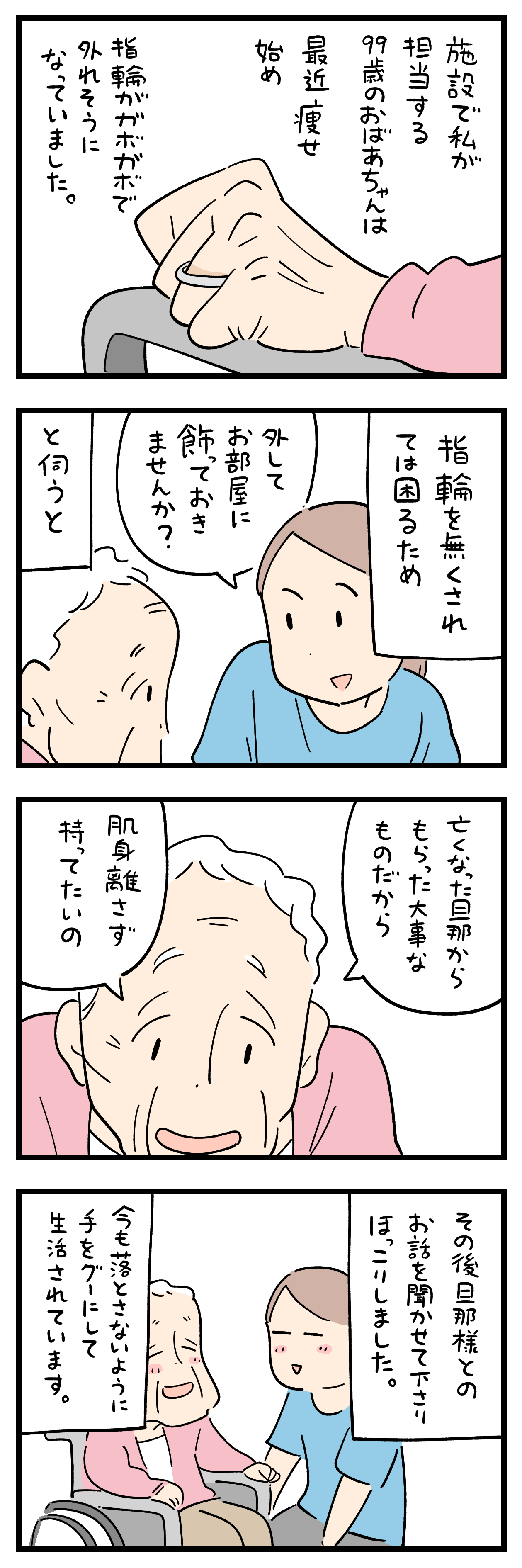 「お年寄りにキュンとした出来事」87 2023年11月20日 新作の予約開始しました ひとこと体験談「お年寄りにキュンとした出来事」その87書籍が出ました ちょっと怖い話50話まとめました キュンとした出来事50話まとめました ひとこと体験談の電子書籍です全巻無料で読めます! 体験談募集中ですツイッターかインスタのDMで教えて下さい! 「フォロワーさんの体験談」カテゴリの最新記事 タグ :#お年寄りにキュンとした出来事 < 前の記事次の記事 > コメント コメント一覧 (10) 1. みかん 2023年11月20日 18:15 このお歳になっても、大事で肌身離さす持っていたい指輪と思い出があるのいいな。 素敵な旦那様で、仲良し夫婦だったんでしょうね( *ˊᵕˋ*) 0 siroyagisanti がしました 2. vivi 2023年11月20日 18:20 大きい指輪にグルグルつけてサイズ変える事なく内径を小さくして使えるようにする物(語彙力ry)持ってるからこのおばあちゃんに差し上げたい。 0 siroyagisanti がしました 3. わ 2023年11月20日 18:39 ペンダントなら無くさないし肌身離さず持っていられる 案の一つとしてはありかと 0 siroyagisanti がしました 9. 知奈津 2023年11月22日 14:57 >>3 転んだときに下手したら引っかかって首絞まっちゃう場合があるかも💦 0 siroyagisanti がしました 4. BB 2023年11月20日 22:40 愛じゃのう❤️ 0 siroyagisanti がしました 5. うちのは… 2023年11月20日 22:48 売っちまっただ。。。 0 siroyagisanti がしました 7. 同じく‼️ 2023年11月21日 01:51 >>5 うちも車検代を払う為、旦那に隠れて10年程前に ダイヤの婚約指輪と結婚指輪をコッソリ売っちゃいました😱💦 今もバレていないけれど、この話を読んで胸が痛くなっちゃいました❗️ 旦那よ ゴメン‼️ (´・ω・`) 💦 0 siroyagisanti がしました 6. 伝説のオムツ交換士 2023年11月20日 22:59 介護士ってねコレが生き甲斐なのよ。あとは「自分も死んで天国に行ったら、今までお世話した沢山の人達が笑顔で待ってくれているのかな。待ってくれていたら良いなぁ」って、信じて生きるしかないの。 お給料が上がらねぇから。 0 siroyagisanti がしました 8. ほっこり 2023年11月21日 08:48 手をグーにしてまで離さないって可愛すぎてニコニコしました 0 siroyagisanti がしました 10. 大きなお世話だけど 2023年11月30日 19:04 美談だけど拘縮しない? 0 siroyagisanti がしました コメントフォーム 名前 コメント 記事の評価 リセット リセット 顔 星 情報を記憶 コメントを投稿する