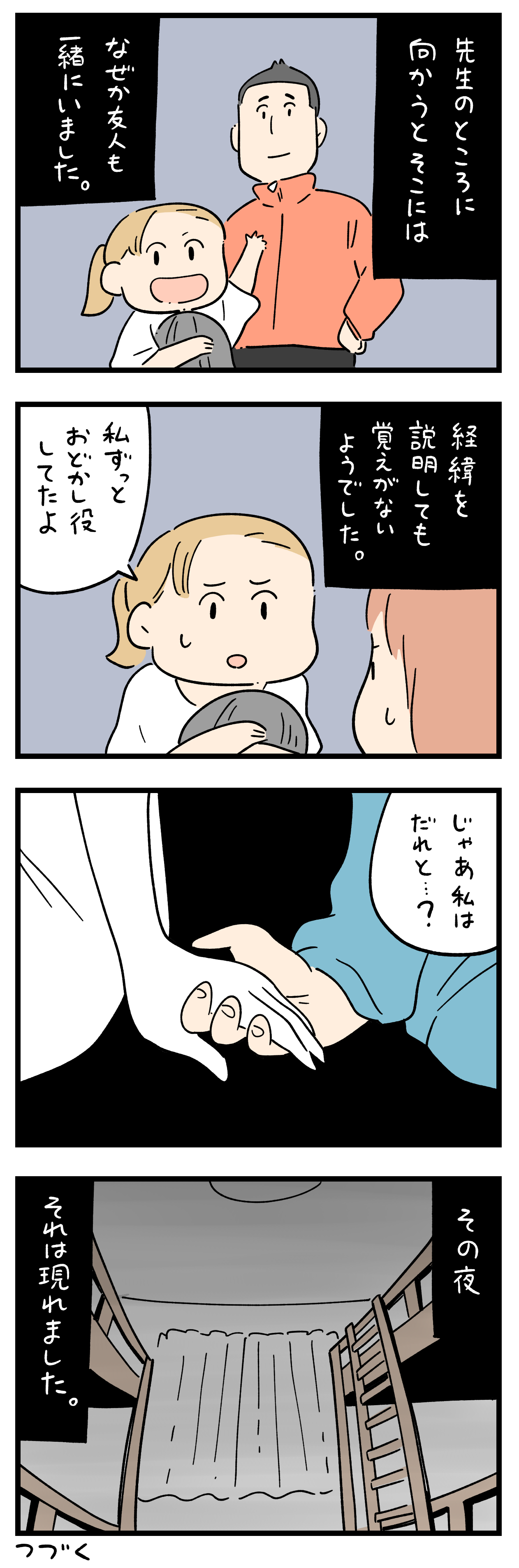 「ちょっと怖い話」162-③ 2023年11月23日 3巻つくりました ひとこと体験談「ちょっと怖い話」その162-③書籍出ました ちょっと怖い話50話まとめました キュンとした出来事50話まとめました ひとこと体験談の電子書籍です全巻無料で読めます! 体験談募集中ですツイッターかインスタのDMで教えて下さい! 「フォロワーさんの体験談」カテゴリの最新記事 タグ :#ちょっと怖い話 < 前の記事次の記事 > コメント コメント一覧 (14) 1. て 2023年11月23日 18:16 じゃあ私は誰と…? それは分からない で終わるのかと思ったら続きあるのかー!! しかも家にまで来る!!こわ!! 0 siroyagisanti がしました 2. 同じく 2023年11月23日 18:25 >>1 まだ続くと思いませんでした。付いてきちゃかー😱 0 siroyagisanti がしました 9. 家じゃなくて 2023年11月23日 20:46 >>1 林間学校の宿じやない? ユースホステルとか、少年自然の家とかだから2段ベッドなんだと思う。 0 siroyagisanti がしました 13. て 2023年11月24日 13:14 >>9 もう一度見てみたら確かに宿舎っぽい… 家とはどこにも書いてないのになぜか4コマ目見た瞬間「家」だと確信していた 4人兄弟としても個人宅なら二段ベッドは一部屋に一つ置くのが普通ですね 0 siroyagisanti がしました 11. マルウ 2023年11月24日 12:40 >>1 その終わり方なら誰かのイタズラの可能性もあったんですけど ラストで「本物」となり凍りました 0 siroyagisanti がしました 3. どんなジャンルのホラーもドンッと来いっ!! 2023年11月23日 18:35 私は誰と…では終わらなかったか…😰 お化けの女の子?がついてきたのは、自分が見えて尚且つ、待っててねって会話しちゃったからかな?→お化け女子は手だけ握ってただけで、一言も言葉は交わしてないけど。 自分に気づいて気に掛けるような言動しちゃったから気に入られたのかも? 投稿者さーんっ!!無事でいて〜😭 0 siroyagisanti がしました 4. 😱 2023年11月23日 18:54 ぎゃー🙀😱 おっそがいがね! 0 siroyagisanti がしました 5. みかん 2023年11月23日 19:15 「すぐ戻ってくるって言ったのに...」って事なのかな? こ、怖い~... 0 siroyagisanti がしました 6. BB 2023年11月23日 19:55 待っててね、って言っちゃったねえ、、、 すぐ戻るからって、、、 寂しがりやさんだったのかな、、、?😨 0 siroyagisanti がしました 7. 👏 2023年11月23日 20:25 続かなくても怖いのに続くんかい〜〜〜😭 0 siroyagisanti がしました 8. 続きが待ち遠しい、、笑 2023年11月23日 20:37 すぐ戻るって、、 待っていたのに、、 約束したのに、、?と憑いてきちゃった? 怖っっ😱👻゛💦 つづきのここから全然更新がなかったら つづくといったのに、、、 続きが気になるのに、、 とコメントにツッコミますね😆笑 0 siroyagisanti がしました 10. 30年後の自分は何歳かなと 2023年11月23日 22:06 この怖い話はとても怖いですね。 実に面白い。続きが楽しみで仕方ありません。 0 siroyagisanti がしました 12. よもぎ 2023年11月24日 13:11 場所によるけど、林間学校の宿って霊体験多すぎじゃない?富士山の麓とか。 ヒトコトシリーズ最長で楽しみ。 0 siroyagisanti がしました 14. ゅぅ 2023年11月24日 17:38 ひぇっ❗ 続いてるぅ…付いてきてるぅ… 0 siroyagisanti がしました コメントフォーム 名前 コメント 記事の評価 リセット リセット 顔 星 情報を記憶 コメントを投稿する