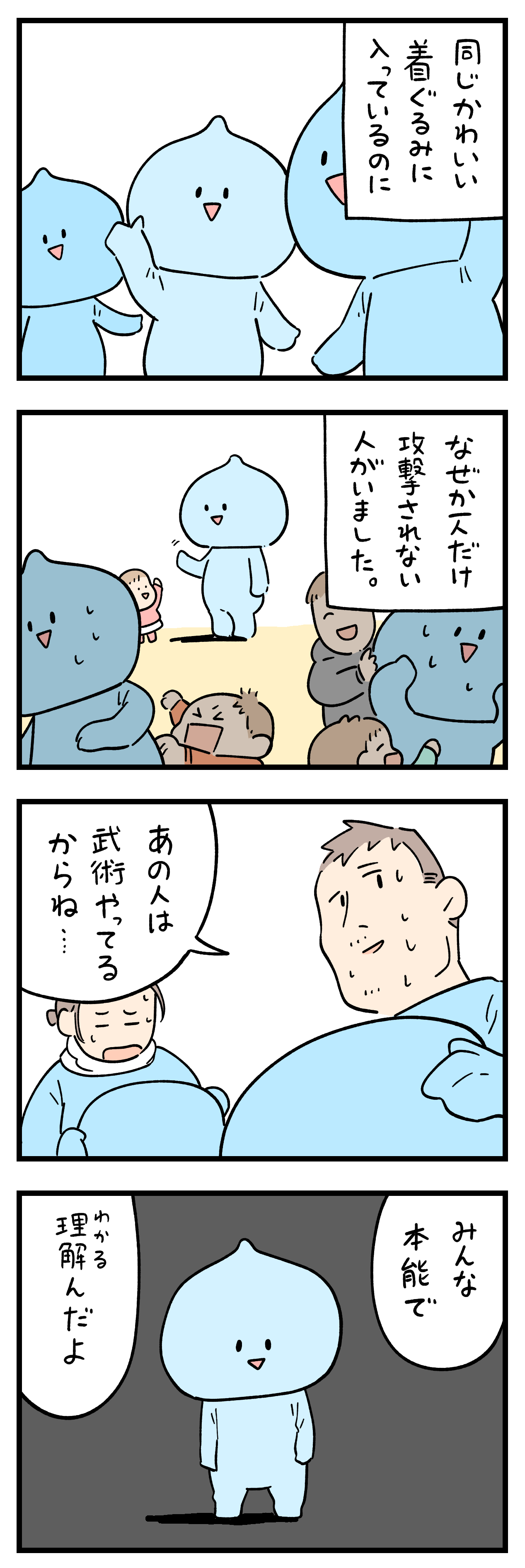 だから、もしかしたらこの着ぐるみさんは子供の攻撃を巧みに避けてて、子供達は「あ、この人には当たんない」と解ったのかも…ね