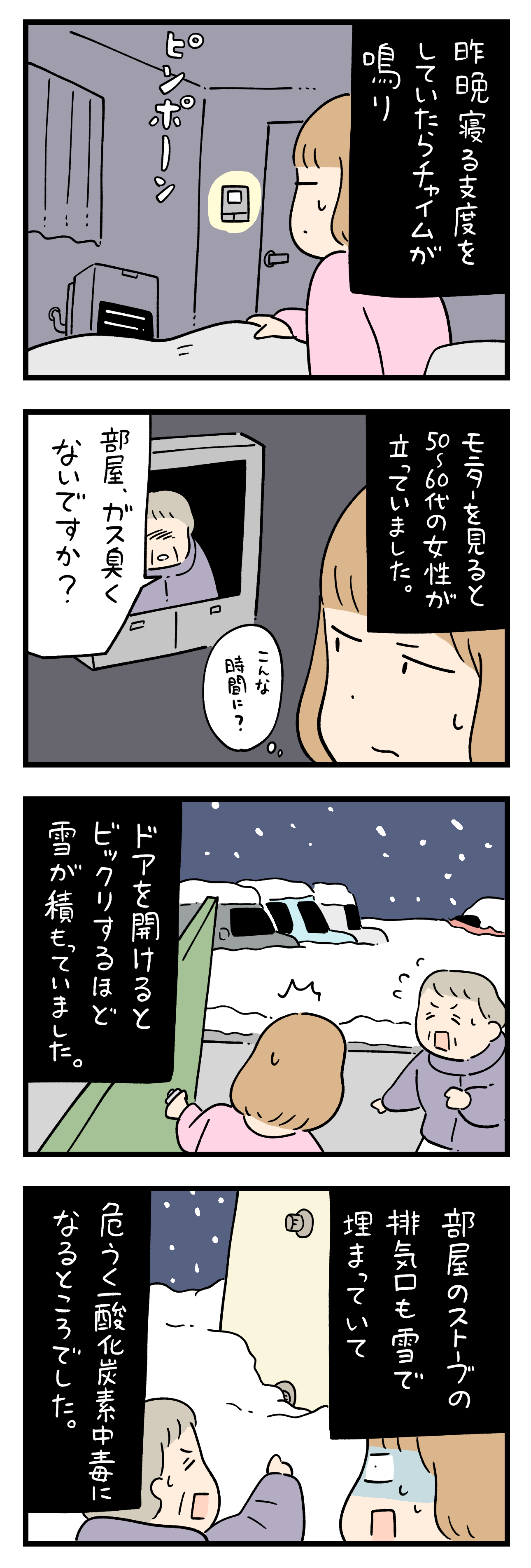 「ちょっと怖い話」172 2024年01月19日 4巻つくりました ひとこと体験談「ちょっと怖い話」その172書籍出ました ちょっと怖い話50話まとめました キュンとした出来事50話まとめました ひとこと体験談の電子書籍です全巻無料で読めます! 体験談募集中ですツイッターかインスタのDMで教えて下さい! 「フォロワーさんの体験談」カテゴリの最新記事 タグ :#ちょっと怖い話 < 前の記事次の記事 > コメント コメント一覧 (9) 1. BB 2024年01月19日 18:09 これは本当に怖い話ですね。車などでも起こります。 皆さんどうぞお気をつけ下さい😨 0 siroyagisanti がしました 2. みかん 2024年01月19日 19:23 わざわざ教えてくれるなんて親切な方。 そのお陰で助かりましたね。 一酸化炭素中毒怖いですね。 0 siroyagisanti がしました 3. わ 2024年01月19日 22:01 人怖系だと思ったら全く別の怖さだった わざわざ知らせてくれたおばあさんめっちゃいい人 0 siroyagisanti がしました 4. みゆ 2024年01月19日 22:24 その女性の家もガス臭くて、外に出たら通風孔が埋まっていたんだろうな。 「危なかった~」と思いながら周囲を見渡したら、同じように通風孔が埋まってる家(アパートの部屋?)が目に入って、心配で知らせてくれたんだろうね。 こういう親切な人、ご近所にいて欲しいです。 0 siroyagisanti がしました 5. 2024年01月20日 02:42 自分なら居留守使ってタヒんでたなー 世の中には良い人もいるって忘れちゃいけないね 0 siroyagisanti がしました 6. 餃子太郎 2024年01月20日 07:11 まさかの良いオバチャンで思わずほっこり。 車も似たような感じで危ないらしいから気をつけないとね。 0 siroyagisanti がしました 7. 2024年01月20日 12:28 命の恩人ですね! でも実際夜遅くにインターホンなったら 怖くて無視しちゃいそう… 0 siroyagisanti がしました 8. ワイも 2024年01月20日 16:57 これで死んだからみんなも気をつけてな 0 siroyagisanti がしました 9. ヒェッ… 2024年02月09日 20:28 >>8 成仏してクレメンス 0 siroyagisanti がしました コメントフォーム 名前 コメント 記事の評価 リセット リセット 顔 星 情報を記憶 コメントを投稿する