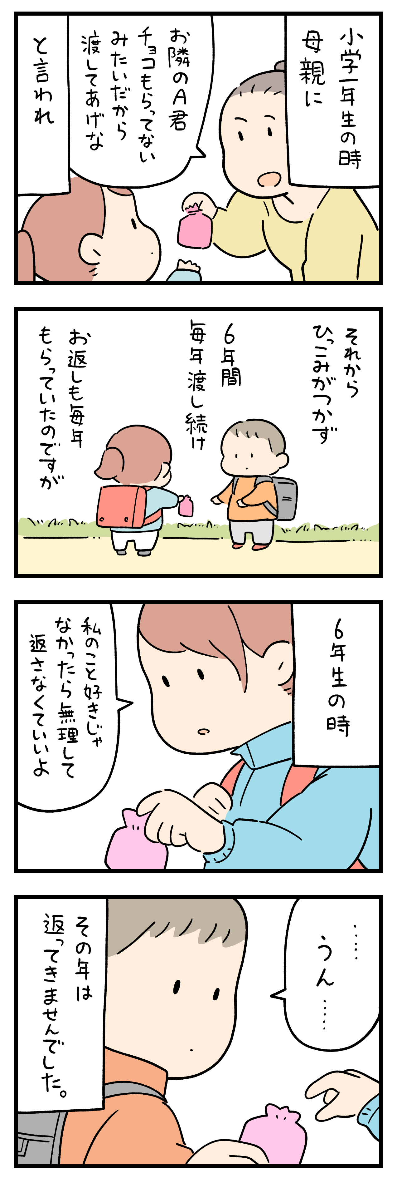 「バレンタインの忘れられない出来事」27 2024年02月12日 ひとこと体験談「バレンタインの忘れられない出来事」その27書籍が出ました ちょっと怖い話50話まとめました キュンとした出来事50話まとめました ひとこと体験談の電子書籍です全巻無料で読めます! 体験談募集中ですツイッターかインスタのDMで教えて下さい! 「フォロワーさんの体験談」カテゴリの最新記事 タグ :#バレンタインの忘れられない出来事 < 前の記事次の記事 > コメント コメント一覧 (9) 1. 英世 2024年02月12日 18:06 切ない🥹 一年生の子に貰ってないみたいだから、っていう言葉もなんだかなあ 0 siroyagisanti がしました 2. BB 2024年02月12日 18:27 母親の気遣いが、小学生には残酷な結果をもたらした。 0 siroyagisanti がしました 3. 見事なわかれ 2024年02月12日 18:57 スッキリしたね 0 siroyagisanti がしました 7. お互いに 2024年02月12日 22:22 >>3 女の子も引っ込みがつかなかっただけですしね 逆に男の子に本気になられても困ってしまうから、いいタイミングでしたね 0 siroyagisanti がしました 4. みかん 2024年02月12日 19:08 2人共クールだなぁ笑 0 siroyagisanti がしました 5. ななし 2024年02月12日 21:49 親同士の付き合いがあって、あげたりもらったりって結構あるんじゃないでしょうか。 本人たちは何とも思ってないよね。 0 siroyagisanti がしました 6. ナースコール連打マシン 2024年02月12日 22:04 ほっこり…じゃあないだとw!!!!!!!???? 0 siroyagisanti がしました 8. バレンタイン イブ❓ 2024年02月13日 22:15 ずっとお返しをしてたみたいだけど・・・ 本当は迷惑だったのかな? 色々、グルグル考えちゃうな 0 siroyagisanti がしました 9. チョコマッチョ 2024年02月14日 08:42 お互いおギリだった。 人との交流なんてこんなもんだよね。 0 siroyagisanti がしました コメントフォーム 名前 コメント 記事の評価 リセット リセット 顔 星 情報を記憶 コメントを投稿する