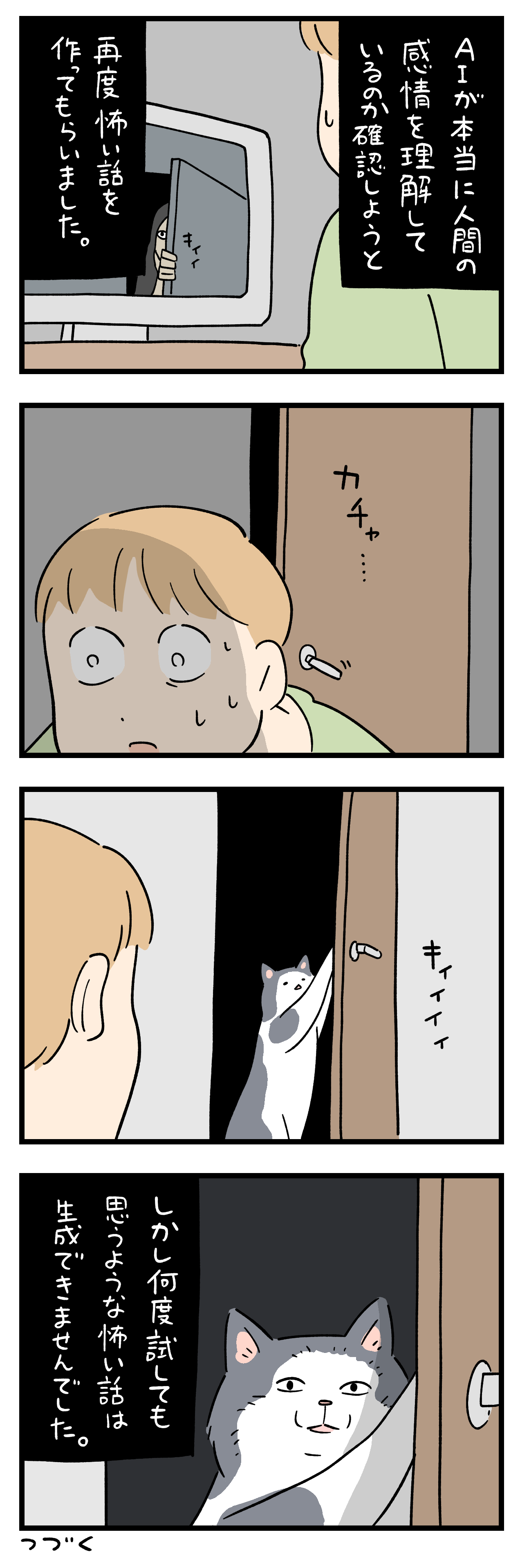 「AIが作った怖い話」3 2024年03月18日 4巻つくりました ひとこと体験談「AIが作った怖い話」その3書籍出ました ちょっと怖い話50話まとめました キュンとした出来事50話まとめました ひとこと体験談の電子書籍です全巻無料で読めます! 体験談募集中ですツイッターかインスタのDMで教えて下さい! 「フォロワーさんの体験談」カテゴリの最新記事 タグ :#AIが作った怖い話 < 前の記事次の記事 > コメント コメント一覧 (4) 1. ナースコール連打マシン 2024年03月18日 19:47 なんか…久々に怖いのがきそうな気がするぜ…w 0 siroyagisanti がしました 2. 猫てww 2024年03月18日 19:48 これこそ笑い話だww 0 siroyagisanti がしました 3. 2024年03月18日 19:54 これが「AIに踊らされる人類」ってやつなのか!? 0 siroyagisanti がしました 4. みこみこ 2024年03月19日 09:06 猫ちゃんの顔が十分怖いです😱 0 siroyagisanti がしました コメントフォーム 名前 コメント 記事の評価 リセット リセット 顔 星 情報を記憶 コメントを投稿する