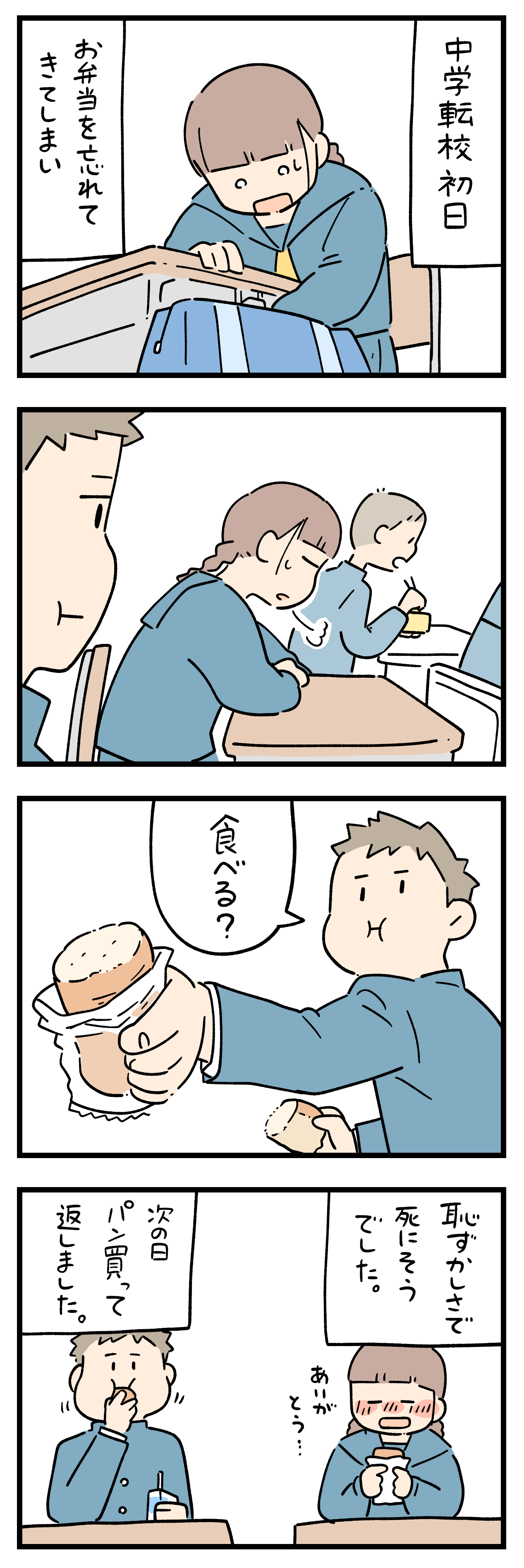 「新生活・新学期やらかした出来事」9 2025年04月25日 ひとこと体験談「新生活・新学期やらかした出来事」その9 ちょっと怖い話50話まとめました キュンとした出来事50話まとめました ひとこと体験談の電子書籍です全巻無料で読めます! 体験談募集中ですツイッターかインスタのDMで教えて下さい! 「フォロワーさんの体験談」カテゴリの最新記事 タグ :#新生活・新学期やらかした出来事 < 前の記事次の記事 > コメント コメント一覧 (4) 1. みかん 2025年04月25日 18:07 転校初日じゃ、色々慌ててたり、緊張してたりして、お弁当忘れちゃったんだね。 お隣の子がパン分けてくれて良かったね♪ 恥ずかしいけど、嬉しい気持ち🤭 0 siroyagisanti がしました 2. BB 2025年04月25日 18:23 いいヤツだ〜‼️ すごく良い思い出だね😊 もしかしたら、クラスも良いクラスなんじゃないかな? もしかしたら、先生も良い先生かも。 自分5回転校した事あるけど、そういうムードだと、そんな時が多かったので、、、 0 siroyagisanti がしました 3. 惚れる 2025年04月25日 22:16 でも食いかけ?だと無理かな 私は席が教壇の真前が嫌で 最後列の男子をチョコで釣って代わってもらった チョコには弱いからね男子は 0 siroyagisanti がしました 4. いい人✨️ 2025年04月26日 08:29 ※3 かじりかけじゃなくて、手で半分にちぎったパンでしょ?ありがたくいただくわ〜 しかも絵で見ると、ちぎった部分が持っている部分と離れてて、切り口に直接手が触れないように配慮してくれてるみたいだし 隣の席の男子、すごくいい人だよ! 0 siroyagisanti がしました コメントフォーム 名前 コメント 記事の評価 リセット リセット 顔 星 情報を記憶 コメントを投稿する