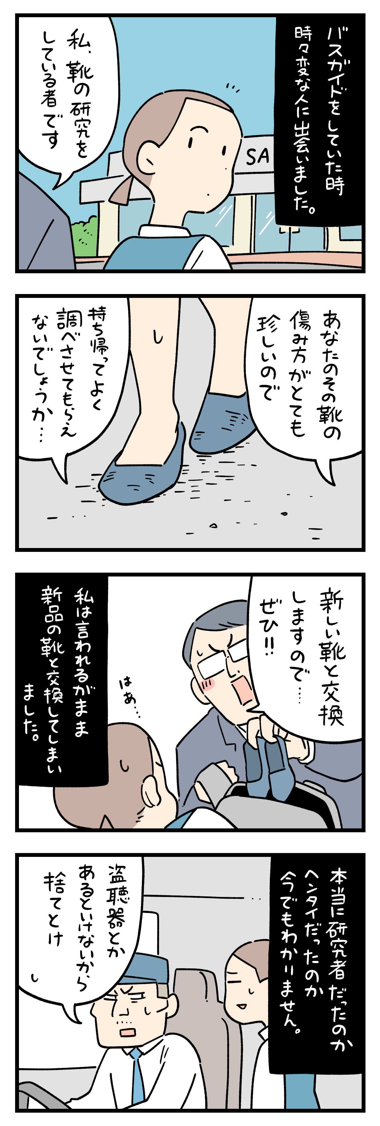 「ちょっと怖い話」289 2025年04月27日 ひとこと体験談「ちょっと怖い話」その289 ちょっと怖い話50話まとめました キュンとした出来事50話まとめました ひとこと体験談の電子書籍です全巻無料で読めます! 体験談募集中ですツイッターかインスタのDMで教えて下さい! 「フォロワーさんの体験談」カテゴリの最新記事 タグ :#ちょっと怖い話 < 前の記事次の記事 > コメント コメント一覧 (6) 1. 数多の… 2025年04月27日 18:41 フェチが存在しますから まず変態の度胸と勢いを舐めてはいけません 0 siroyagisanti がしました 2. BB 2025年04月27日 18:53 ヘンタイなの? 怖いよ〜😱 名刺もらうとか、何か証拠ないなら、渡さないで〜! 0 siroyagisanti がしました 3. 怪しい 2025年04月27日 19:09 新しい靴を用意してたってことは、どこのメーカーのどの靴か特定していた訳で。その熱意も怖いし、本当の研究者なら特定に費やす時間や労力を研究に充てそうだし、なんなら「必ずお返しするのでその間代わりのものを」って別の靴用意しそう いやその場合でも隠しカメラ仕込んで充分なデータが撮れた頃合いで返してもらうとかもあり得る 名刺あっても偽造の可能性もあるし疑い出すとキリない 結論受け取らないが一番 0 siroyagisanti がしました 4. 運転手さんの 2025年04月28日 09:44 「捨てとけ」の理由が⋯⋯危機管理能力高いな!この運転手さんのバスに乗りたい💨💨💨 0 siroyagisanti がしました 5. よもだぎ 2025年05月01日 10:02 添乗員としてお客の言うことを無碍にできなかったんだろうけど、想い出のある大事な靴なんです、で突っぱね…られないか。大抵上品な断り方しようとするとド厚かましい系の人は調子づくのよね…。 ちゃんと捨ててね。 0 siroyagisanti がしました 6. 🐱 2025年06月15日 23:49 怖いよ。 運転手のおじさんの助言ナイスですね。 同僚や先輩のバスガイドにも同じ事されてないかを聞いてみたら? 熱心な営業マンだったら社名と自分の名前が書いてある名刺を渡してると思うけど、やっぱり変態だったりするのかな? それとも主人公に対して恋愛感情を抱いてたのかね…。 盗聴器があったら怖いですね…。 主人公のバスガイドさんが危害加えられなくて良かったです。 0 siroyagisanti がしました コメントフォーム 名前 コメント 記事の評価 リセット リセット 顔 星 情報を記憶 コメントを投稿する