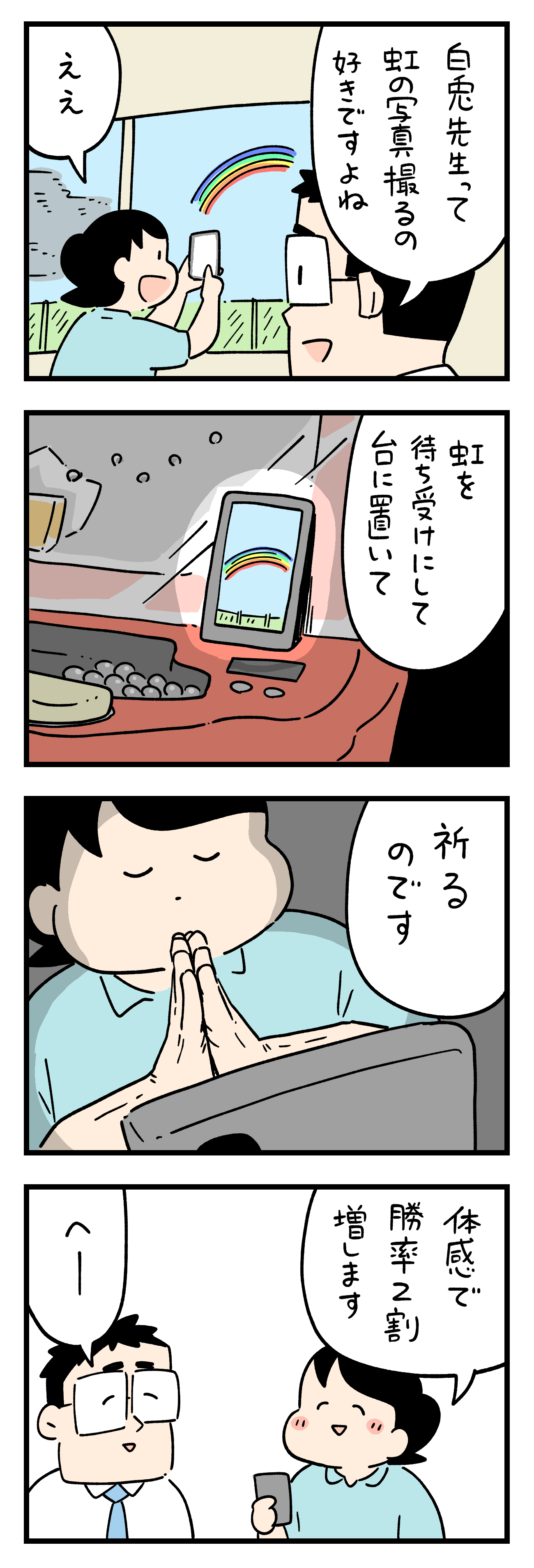 「いのり」 2025年06月13日 『白兎先生は働かない』のおまけ4コマです。書籍は5月26日発売です。「いのり」 カテゴリなしの他の記事 タグ :#白兎先生は働かない < 前の記事次の記事 > コメント コメント一覧 (3) 1. BB 2025年06月14日 00:28 そっか〜❣️私も虹の写真いっぱいあるから、お祈りします🙏 0 siroyagisanti がしました 2. セカ 2025年06月14日 06:33 お祈りwww でもそれいいかも!!! 今度虹を見たら写真とろ! 0 siroyagisanti がしました 3. これが 2025年06月14日 11:16 パチカスの思考回路… 0 siroyagisanti がしました コメントフォーム 名前 コメント 記事の評価 リセット リセット 顔 星 情報を記憶 コメントを投稿する