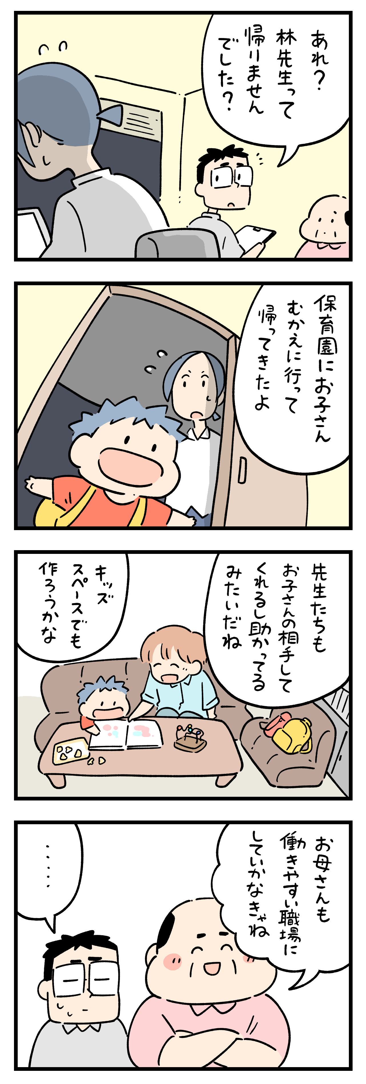 「子連れ残業」 2025年06月14日 『白兎先生は働かない』のおまけ4コマです。書籍は5月26日発売です。「子連れ残業」 カテゴリなしの他の記事 タグ :#白兎先生は働かない < 前の記事次の記事 > コメント コメント一覧 (6) 1. 名無し 2025年06月14日 21:13 教師にならないほうが幸せだね❀(*´▽`*)❀ 0 siroyagisanti がしました 2. セカ 2025年06月14日 22:03 幼稚園の保育士になった方が… でも、男女で差別される時代だからな。 なかなか保育士にはなれないんんだよな。 まぁ、昔より減ってるみたいだけど(差別が) 0 siroyagisanti がしました 3. BB 2025年06月15日 00:46 働きやすい職場を履き違えてますな。 0 siroyagisanti がしました 4. みかん 2025年06月15日 02:42 キッズスペースじゃなくて、残業せずに済むのが、働きやすい環境なのよ。 0 siroyagisanti がしました 5. ぶん 2025年06月15日 18:33 保育士の友人が、早朝シフトの保育士さんの子供を預かるために、早朝に開園する保育園に勤めています。 友人は、「なんか方法ないんかい?」と。 0 siroyagisanti がしました 6. 🐱 2025年06月16日 00:58 早く帰らせてあげて😡 帰ったあとが一番大変でしょうに。 キッズスペースとかアホな事言ってんじゃないよ。 子連れ残業してるママ、こんな職場辞めて違う場所で働きましょう。 私は自分の娘が子連れ残業して大変な思いしてる所を見たら泣きたくなりますよ😢 0 siroyagisanti がしました コメントフォーム 名前 コメント 記事の評価 リセット リセット 顔 星 情報を記憶 コメントを投稿する