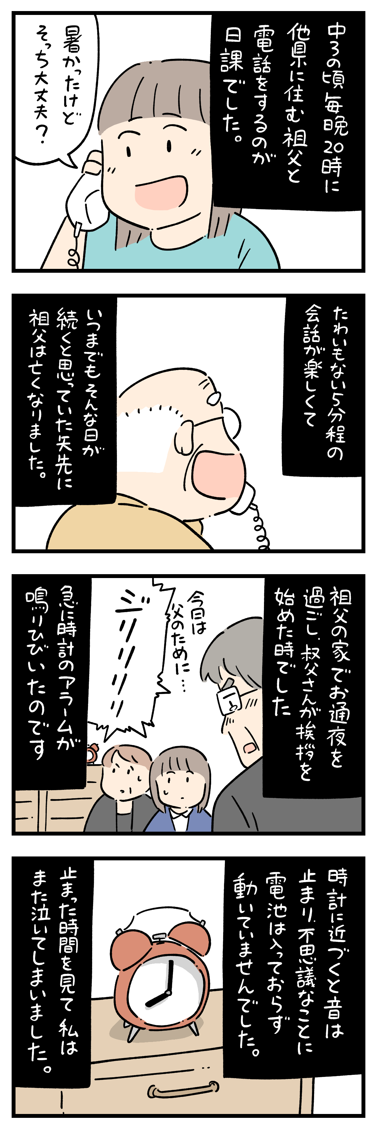 「ちょっと怖い話」311 2025年07月27日 ちにかみのLINEスタンプ作りました! ひとこと体験談「ちょっと怖い話」その311 ちょっと怖い話50話まとめました キュンとした出来事50話まとめました ひとこと体験談の電子書籍です全巻無料で読めます! 体験談募集中ですツイッターかインスタのDMで教えて下さい! 「フォロワーさんの体験談」カテゴリの最新記事 タグ :#ちょっと怖い話 < 前の記事次の記事 > コメント コメント一覧 (4) 1. みかん 2025年07月27日 19:44 じいちゃんも毎日の電話が楽しみだったんだね😢 0 siroyagisanti がしました 2. ウルウル🥹 2025年07月27日 23:18 この日もじいちゃん最後にお話ししたかったんだね 0 siroyagisanti がしました 3. BB 2025年07月28日 01:02 うちのじいさまも、亡くなって数日後、火も煙もないのに、火災報知器鳴らしました。 まだまだ長生きしてほしかった。 寂しいよ、、、 0 siroyagisanti がしました 4. 🐱 2025年08月03日 19:50 お祖父様はお孫さんとの20時からの電話を毎日楽しみにしていたんでしょうね…。 止まった時間にお祖父様の愛を感じました😭 最後の別れを愛するお孫さんに伝えたかったのかな😢 0 siroyagisanti がしました コメントフォーム 名前 コメント 記事の評価 リセット リセット 顔 星 情報を記憶 コメントを投稿する