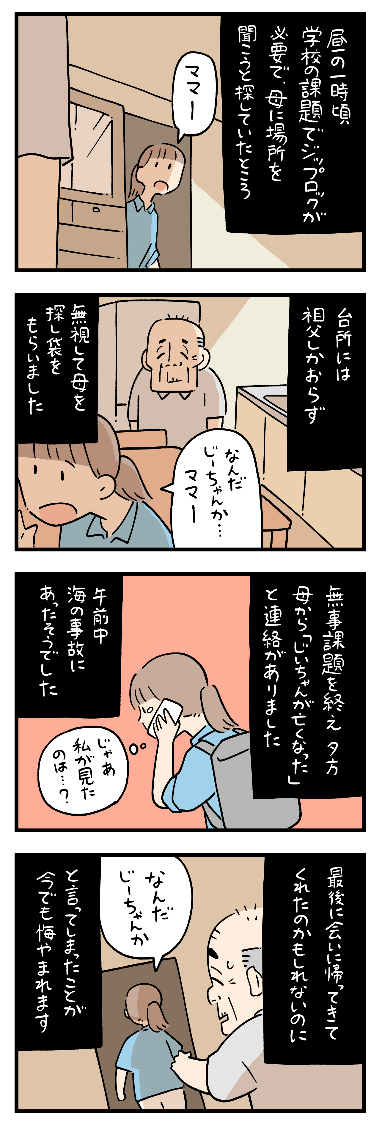 「ちょっと怖い話」354 2025年11月02日 ちにかみのLINEスタンプ作りました! ひとこと体験談「ちょっと怖い話」その354 ちょっと怖い話50話まとめました キュンとした出来事50話まとめました ひとこと体験談の電子書籍です全巻無料で読めます! 体験談募集中ですツイッターかインスタのDMで教えて下さい! 「フォロワーさんの体験談」カテゴリの最新記事 タグ :#ちょっと怖い話 < 前の記事次の記事 > コメント コメント一覧 (4) 1. みかん 2025年11月02日 18:32 じいちゃん、最後に会いに来てくれたんだ。 でも、それが最後だとは思わないから仕方ないですよ😔 じいちゃんも、孫を一目見ておきたかったのかもしれないですよ。 これからもじいちゃんを忘れずにいてあげて下さい😊 0 siroyagisanti がしました 2. BB 2025年11月02日 18:55 それはしょうがなかったですね。 いつも通りのあなたを見に来ているくれたんだから、大丈夫だと思いますよ。 会えて良かったですね。 0 siroyagisanti がしました 3. ありゃ 2025年11月02日 19:00 おじいちゃんもあなたも、ちょっと間が悪かったですね😓 また会いに来てくれると良いですね🥰 0 siroyagisanti がしました 4. ありゃ 2025年11月02日 19:09 >>3 コメント間違えました ごめんなさい 最初の一文は無しです💦 また会いに来てくれると良いですね🥰 のみで〜💦 0 siroyagisanti がしました コメントフォーム 名前 コメント 記事の評価 リセット リセット 顔 星 情報を記憶 コメントを投稿する