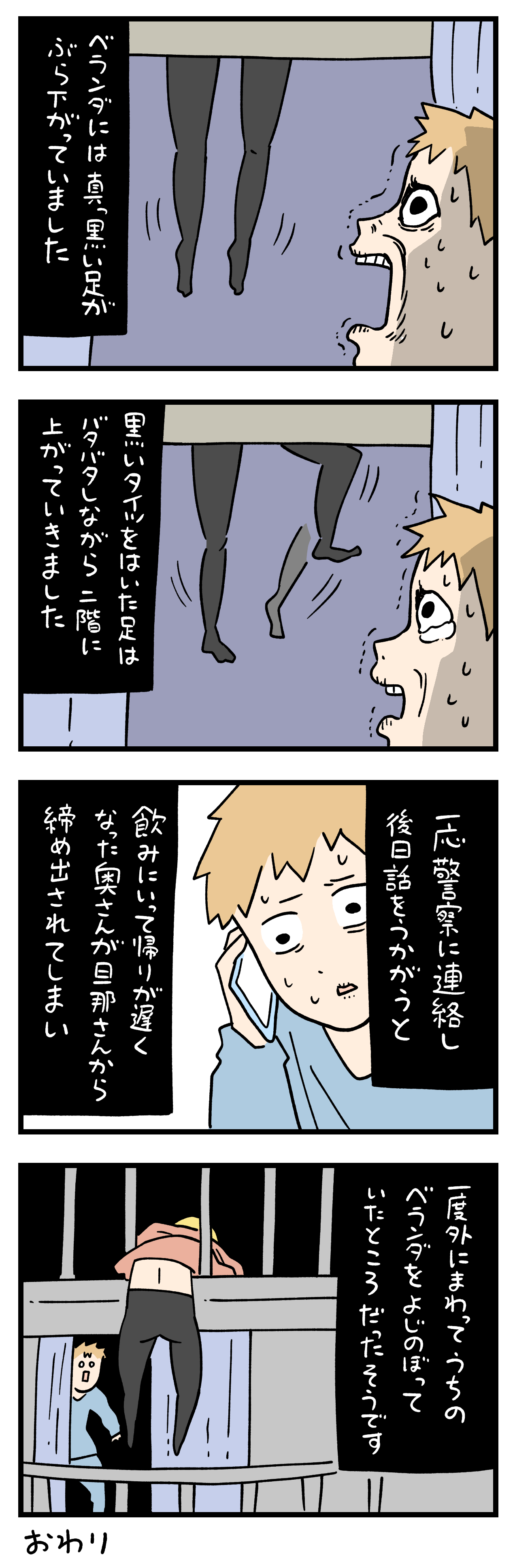 一旦はベランダに這い上がったものの、足を滑らせて下半身ビローンしたの?