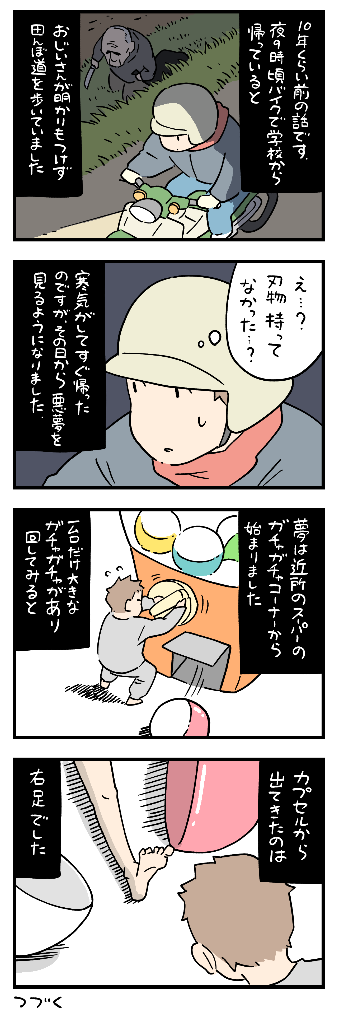 「ちょっと怖い話」380-① 2026年01月15日 ちにかみのLINEスタンプ作りました! ひとこと体験談「ちょっと怖い話」その380-① ちょっと怖い話50話まとめました キュンとした出来事50話まとめました ひとこと体験談の電子書籍です全巻無料で読めます! 体験談募集中ですツイッターかインスタのDMで教えて下さい! 「フォロワーさんの体験談」カテゴリの最新記事 タグ :#ちょっと怖い話 < 前の記事次の記事 > コメント コメント一覧 (5) 1. BB 2026年01月15日 18:56 これはかなりえげつないのかもしれない気がします🥺 ナタみたいな物持ってるオジイが怖い😱 0 siroyagisanti がしました 2. は…? 2026年01月15日 19:46 何だこの話…?バラバラ○体の暗示? めっちゃ怖 0 siroyagisanti がしました 3. みかん 2026年01月15日 20:12 え。そのおじいは実在のおじい?生き物では無いおじい?刃物は…何 !?😳 ガチャガチャも、明日以降色んな部位が出てくるよね😨 それが揃った時にどうなるんだろ…😱 0 siroyagisanti がしました 4. 🐱 2026年01月15日 21:04 夜の田んぼ道にナイフ持ったお爺さん怖い…。 そしてナイフだけじゃなくて黒い袋を引きずってるのを見つけちゃったよ…。 その黒い袋の中身はもしかして…。 そして投稿者さんの夢に出てきたカプセルの中に入っていた足は投稿者さんに何かを伝えたいって事なんでしょうかね…。 0 siroyagisanti がしました 5. ちょっと 2026年01月15日 21:54 だよね? 0 siroyagisanti がしました コメントフォーム 名前 コメント 記事の評価 リセット リセット 顔 星 情報を記憶 コメントを投稿する
