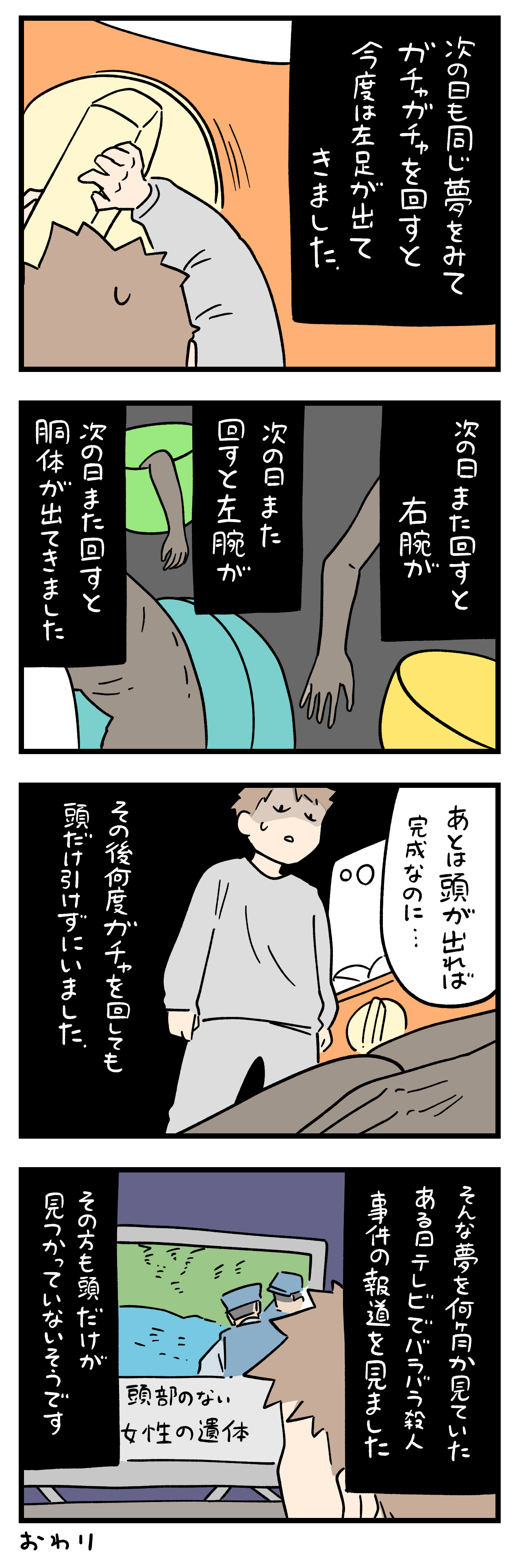 「ちょっと怖い話」380-② 2026年01月16日 ちにかみのLINEスタンプ作りました! ひとこと体験談「ちょっと怖い話」その380-② ちょっと怖い話50話まとめました キュンとした出来事50話まとめました ひとこと体験談の電子書籍です全巻無料で読めます! 体験談募集中ですツイッターかインスタのDMで教えて下さい! 「フォロワーさんの体験談」カテゴリの最新記事 タグ :#ちょっと怖い話 < 前の記事次の記事 > コメント コメント一覧 (3) 1. BB 2026年01月16日 18:54 本当なんでしょうか? あのおじいが犯人なんでしょうか? 現実の世界でも、5体全ては見つからない方もおられますから、その部分は一体どこに行ってしまったのでしょう。 ちゃんと揃えてさしあげたいですよね、、、被害者さん,いつの世もお気の毒です。 0 siroyagisanti がしました 2. みかん 2026年01月16日 19:20 もしかしたら、犯人はあのおじい?😨 すれ違ったっていうちょっとの縁だけで、おじいの怨念というか私怨というか、それがそんな夢を見させたのかな? 怖い怖い😱 そんな縁要らん😨 0 siroyagisanti がしました 3. これって 2026年01月17日 17:10 何が夢を見させたのかね? ある意味予知夢だったのかもしれないね。 0 siroyagisanti がしました コメントフォーム 名前 コメント 記事の評価 リセット リセット 顔 星 情報を記憶 コメントを投稿する